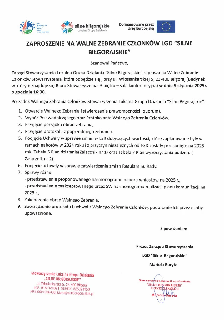 Zarząd Lokalnej Grupy Działania „Silne Biłgorajskie” informuje, że na podstawie Uchwały NR 1/09 podjętej przez Walne Zgromadzenie Członków w dniu